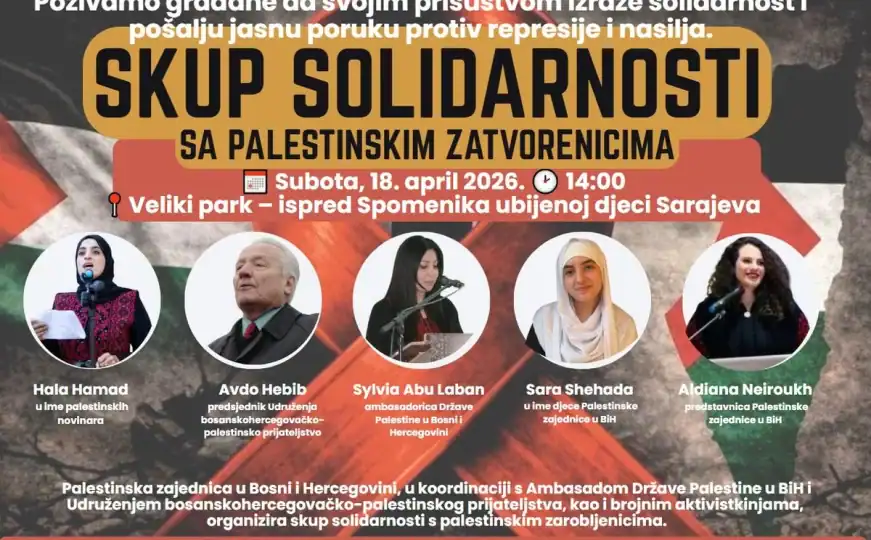 Palestinska zajednica u Bosni i Hercegovini održat će danas, 18. aprila, u Velikom parku u Sarajevu, skup solidarnosti povodom Dana palestinskih zatvorenika. Skup se održava u koordinaciji sa Ambasadom Države Palestine u BiH, Udruženjem bosanskohercegovačko-palestinskog prijateljstva, kao i brojnim aktivistima i aktivistkinjama. “Skup se održava s ciljem ukazivanja na težak položaj više od 9.600 palestinskih zatvorenika, […]