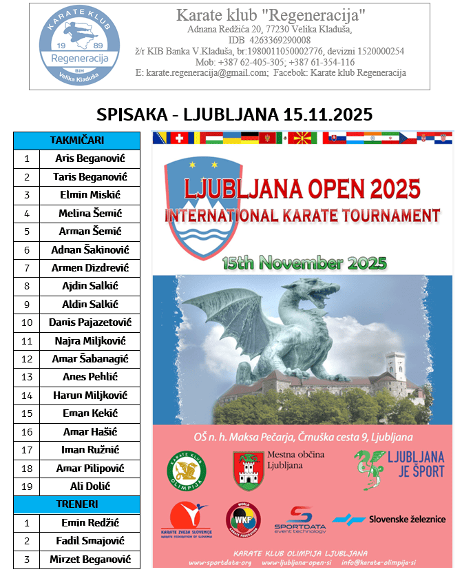 Karate klub “Regeneracija” nastupio je 15.11.2025. godine na međunarodnom turniru LJUBLJANA OPEN 2025, kao dio selekcije Karate saveza Unsko-sanskog kantona (KS USK)
