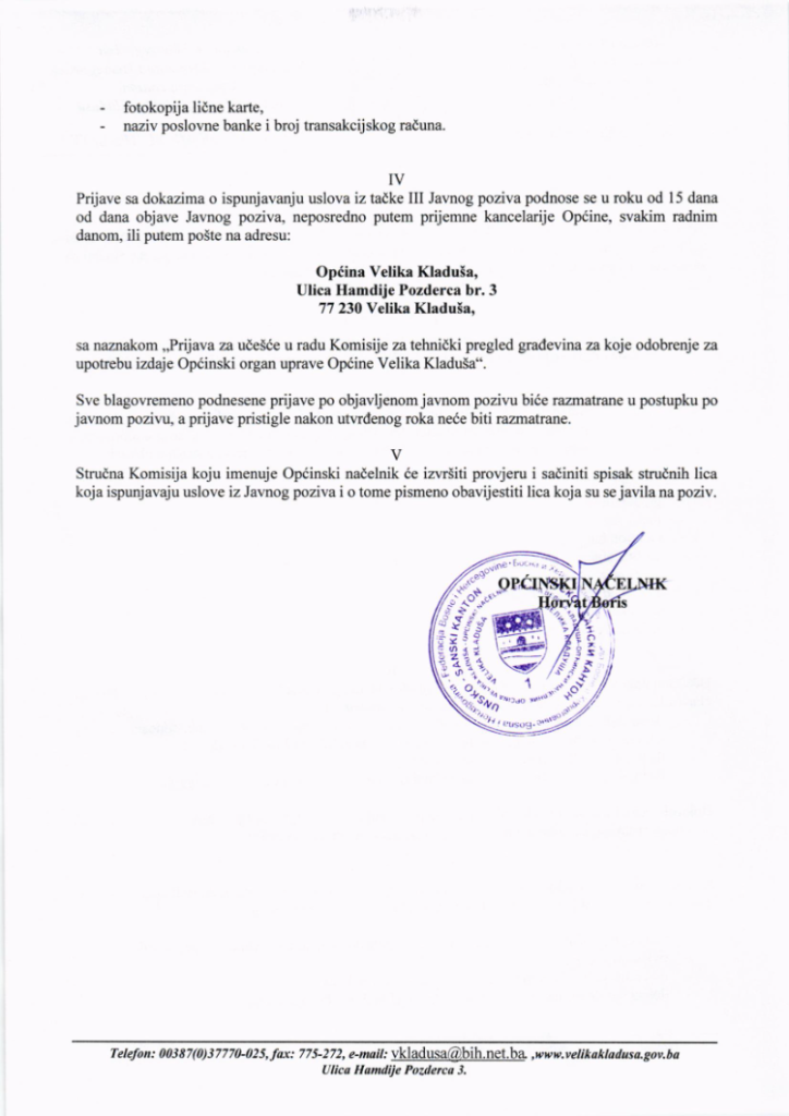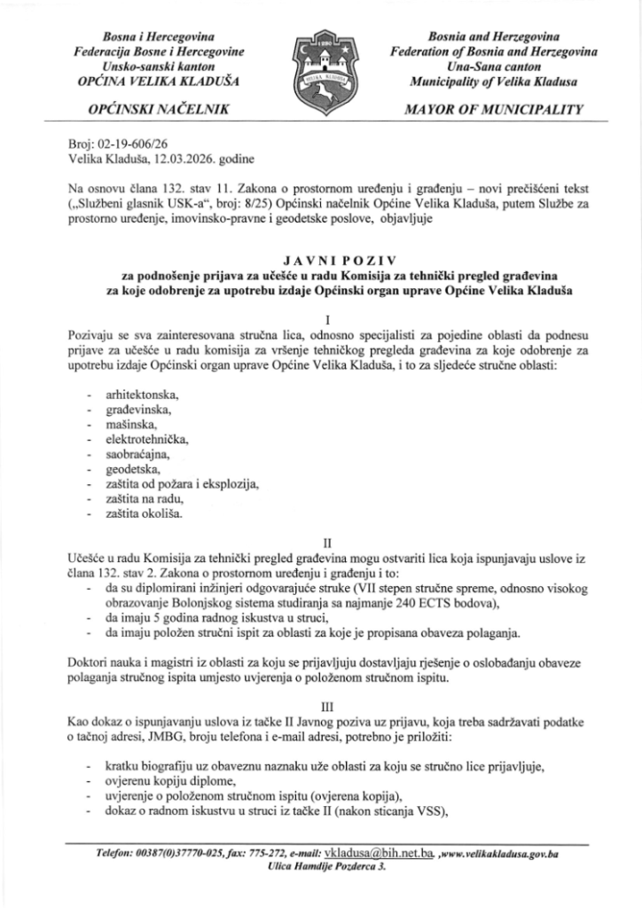 Javni poziv za podnošenje prijava za učešće u radu Komisije za tehnički pregled građevina za koje odobrenje za upotrebu izdaje Općinski organ uprave općine Velika Kladuša