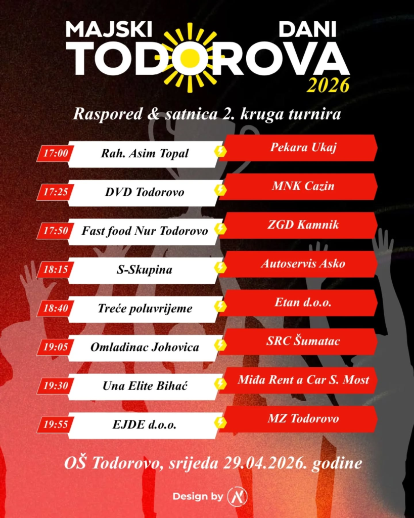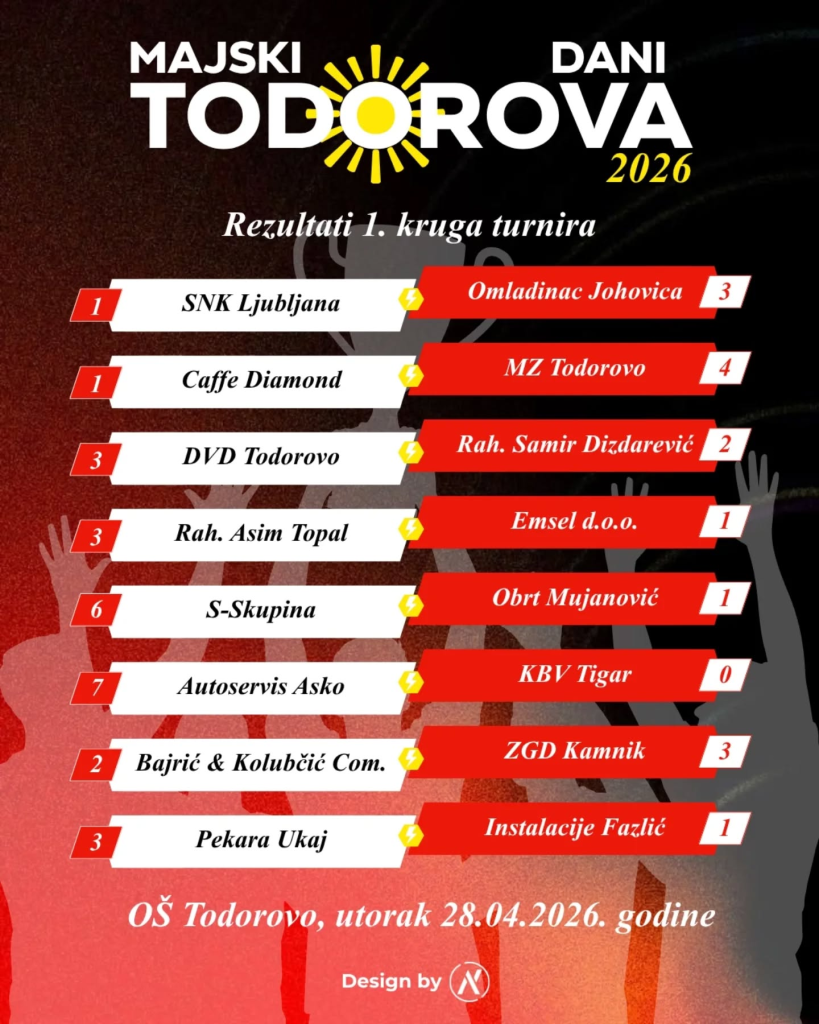 Utakmicama prvog kola malonogometnog turnira jučer je započela trodnevna manifestacija „Majski dani Todorova 2026“, koja i ove godine privlači veliki broj učesnika, posjetilaca i svih ljubitelja sporta, druženja i dobre atmosfere.